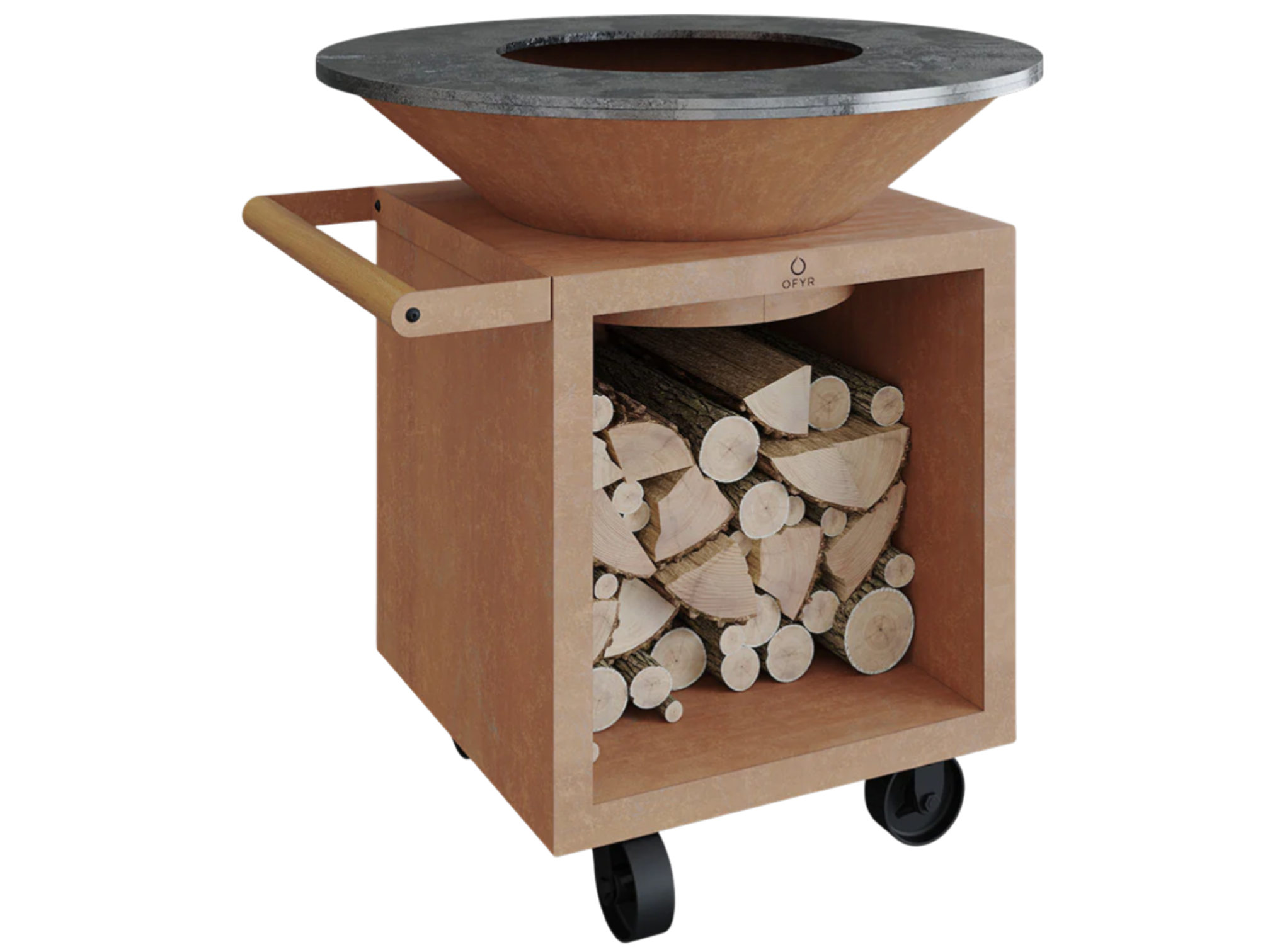 Le brasero Classic Corten 100 cm PRO avec rangement combine esthétique brute et fonctionnalité maximale. Sa base en acier Corten intègre un espace de rangement élégant pour le bois et se déplace facilement grâce à sa poignée en teck et ses roues robustes.